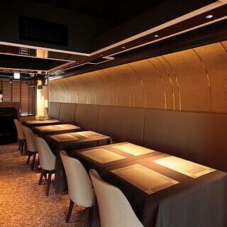シックで落ち着いた雰囲気の店内は、大人の隠れ家のような空間です。特にバーカウンターは、お一人様でも気兼ねなくご利用いただけます。大切な人との語らいやデート、自分だけの時間を過ごしたい時にも◎貸切も承っておりますので、会社の宴会やパーティーなど様々なシーンでご利用ください。